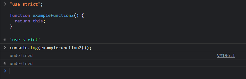 하지만 strict 모드에서는 조금 다르게 작동합니다. 함수 내의 this값에 디폴트 값이 설정되어있지 않기 때문에 undefined가 됩니다.