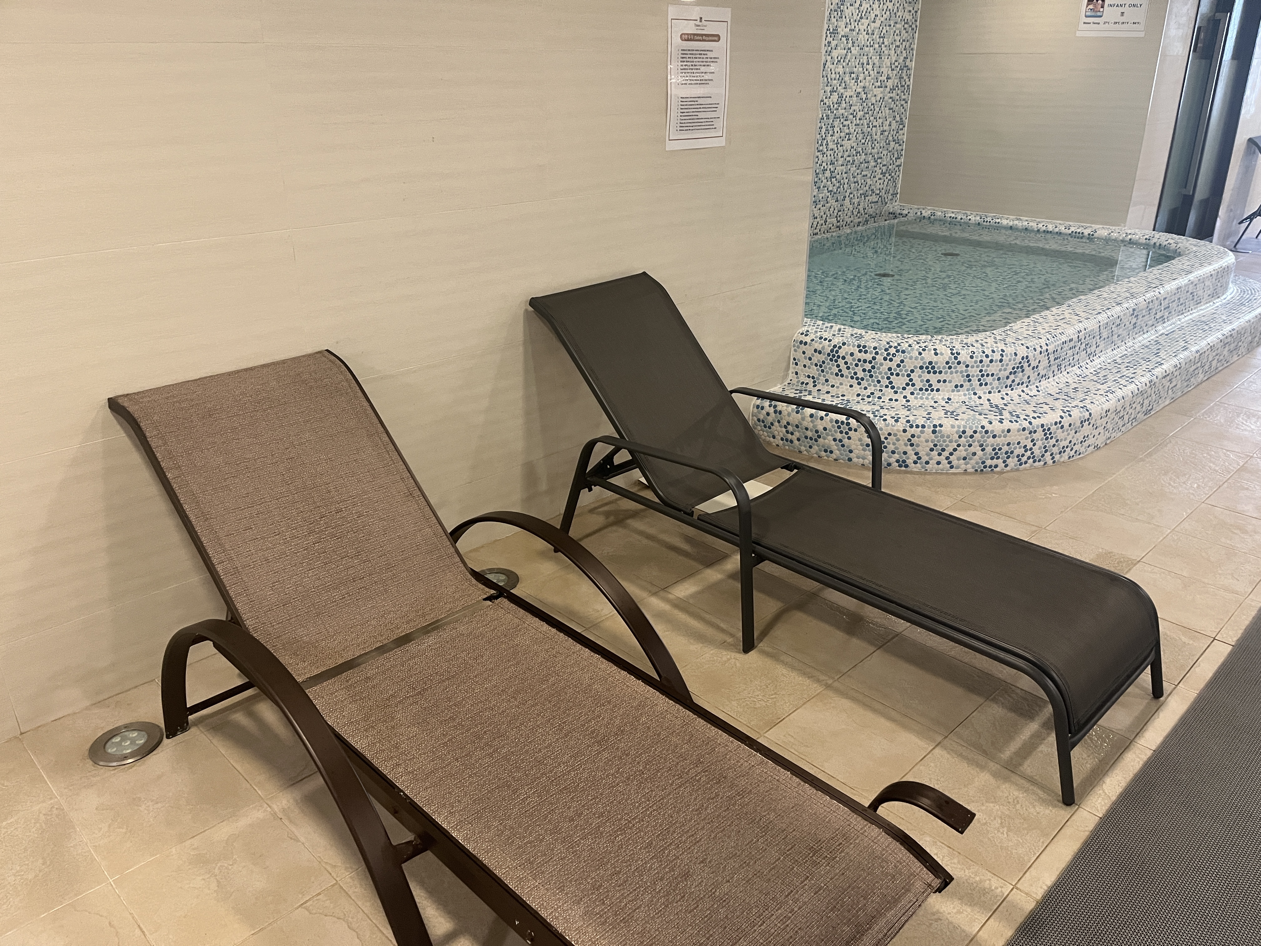 수영장은 생각보다 그리 크지는 않았다. 가로 약 20M 정도 되어 보였고(실제로는 아닐 수도 있다), 누워있을 수 있는 벤치(?)가 두 개 정도 있었다. 유아용 풀도 조그맣게 있었다.